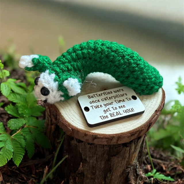 Crocheted positive caterpillar with the following pun on a wooden sign