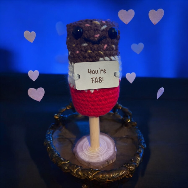 Crocheted Positive pal (Fab Ice Lolly) with the following pun on a wooden sign