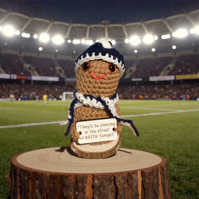 Crocheted positive pal (RAITH ROVERS FOOTBALL FAN) with the following pun on a wooden sign