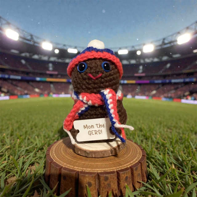 Crocheted positive pal (Rangers fan) with the following pin on a wooden sign