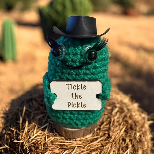 Crocheted positive pal (pickle) wearing a cowboy hat