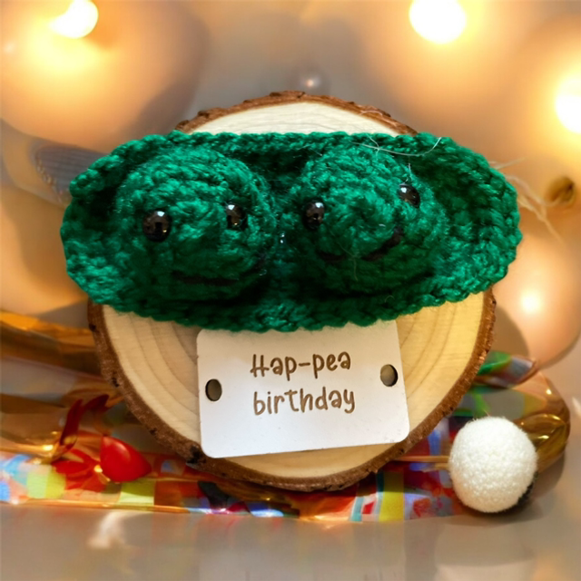 Crocheted positive pals (hap-pea birthday) with the following message on a wooden sign