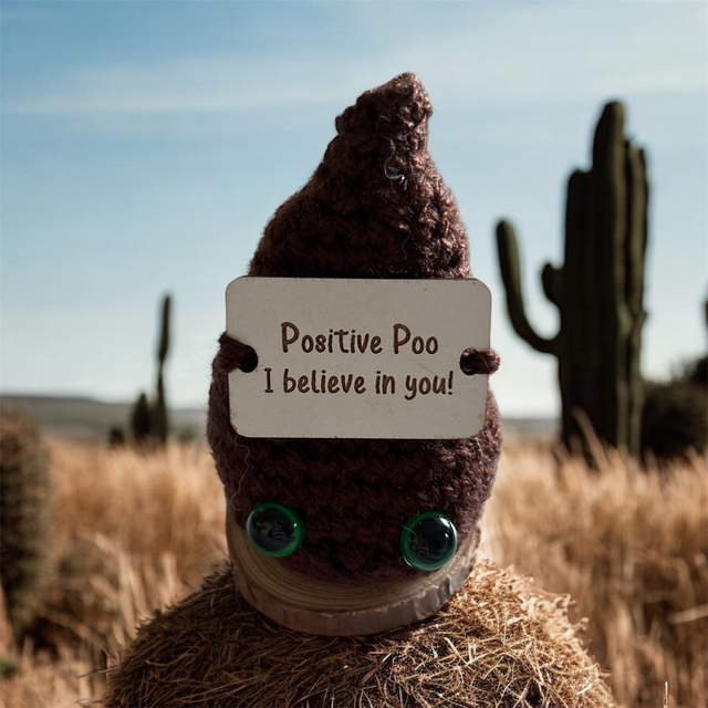 Crocheted positive pal (child poo) with the following pun on a wooden sign