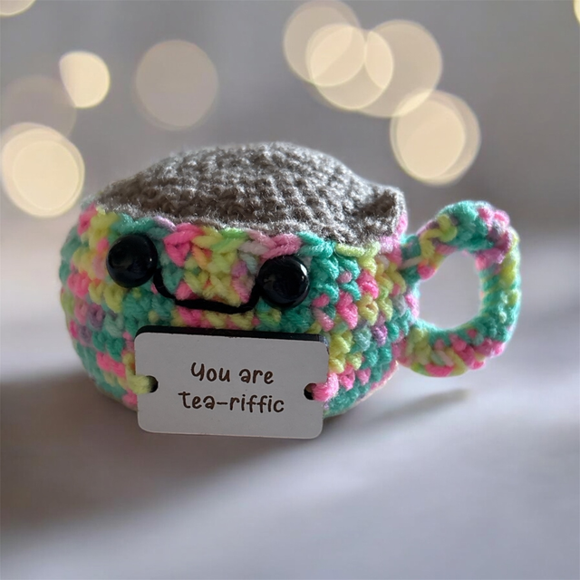 Crocheted positive pal ( teariffic cup) with the following pun on a wooden sign